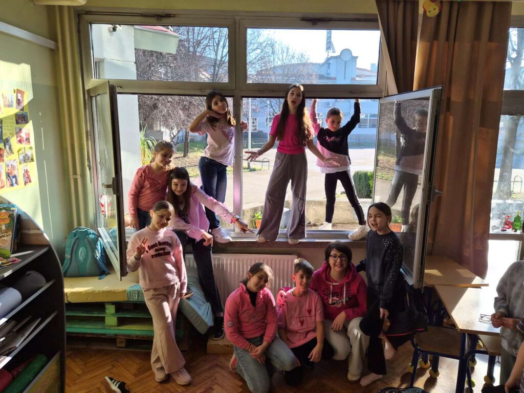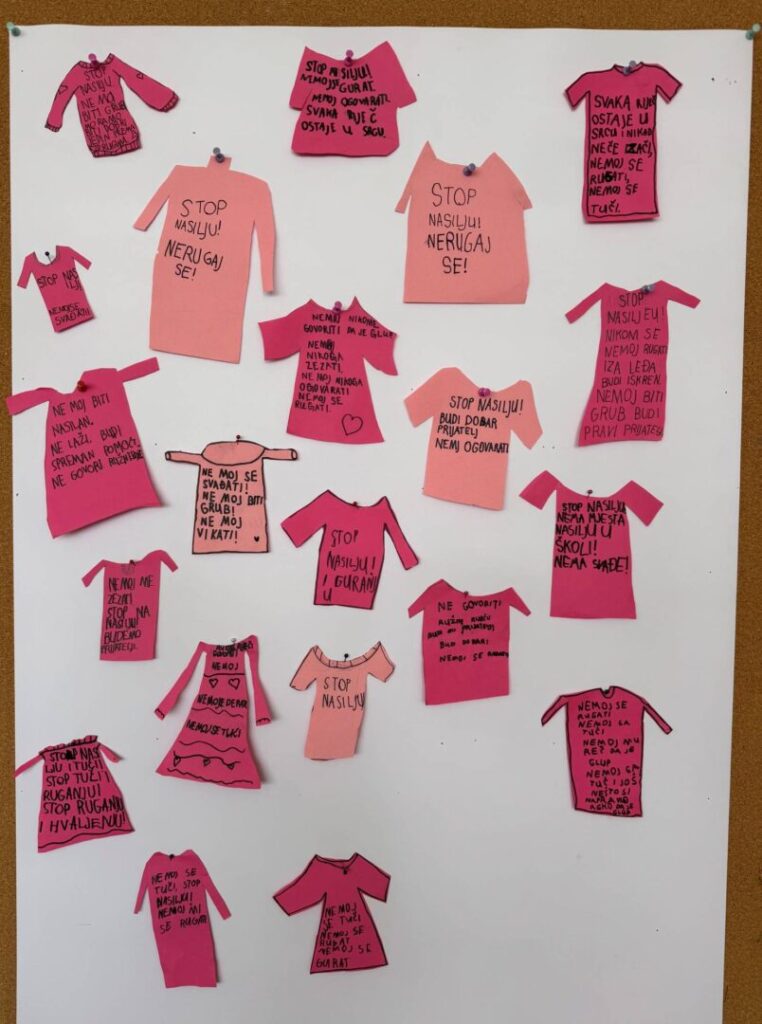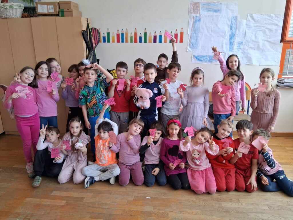 Učenici 1.f i 4.c razreda obilježili su sa svojim učiteljicama Dan ružičastih majica – dan posvećen borbi protiv vršnjačkog nasilja, promicanju prijateljstva i međusobnog poštovanja.
