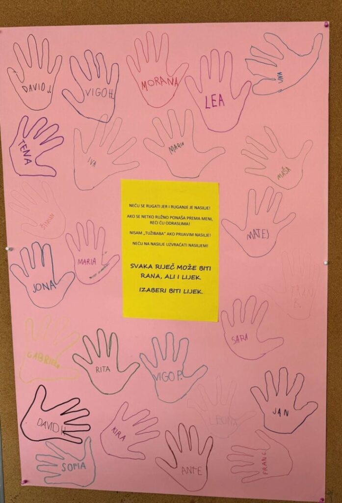 Učenici 1.f razreda su, zajedno sa svojom učiteljicom Lucijom Matić, na satu razrednika gledali videozapis o nenasilnoj komunikaciji te slušali pjesme “Ne rugaj se” i “Kad bi svi”. Potom su uslijedile razne aktivnosti tijekom kojih su učenici imali priliku naučiti kako prepoznati nasilje, kako reagirati u takvim situacijama te kome se obratiti za pomoć.