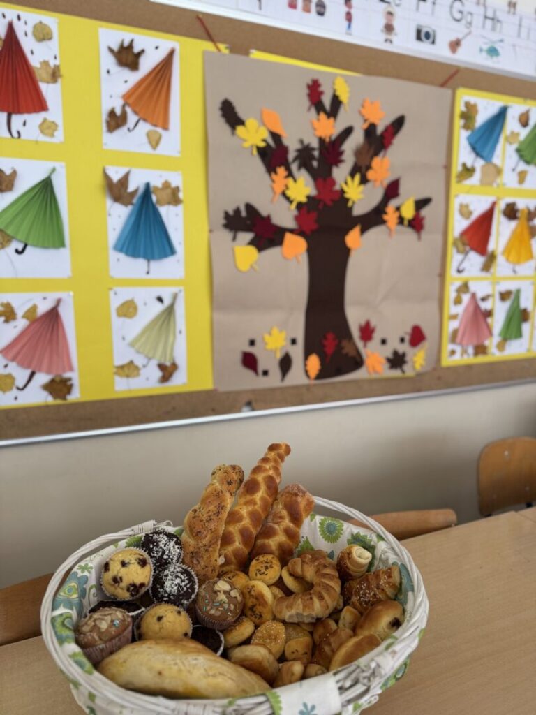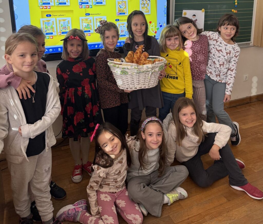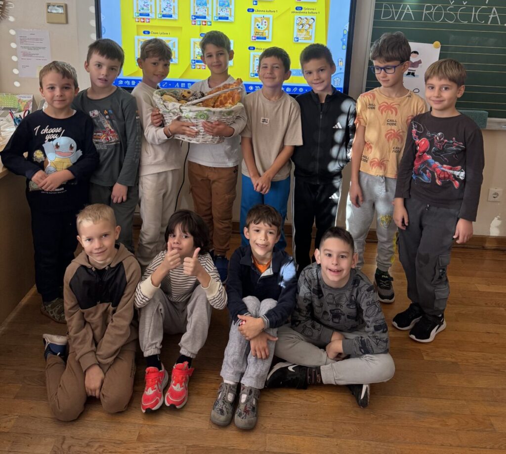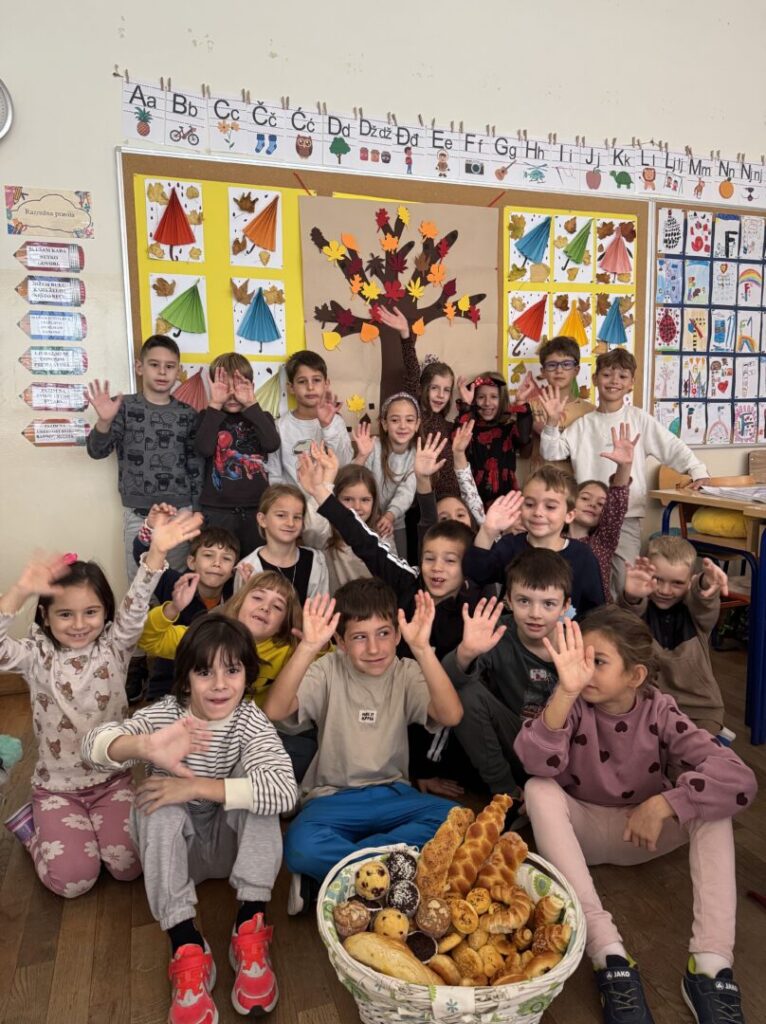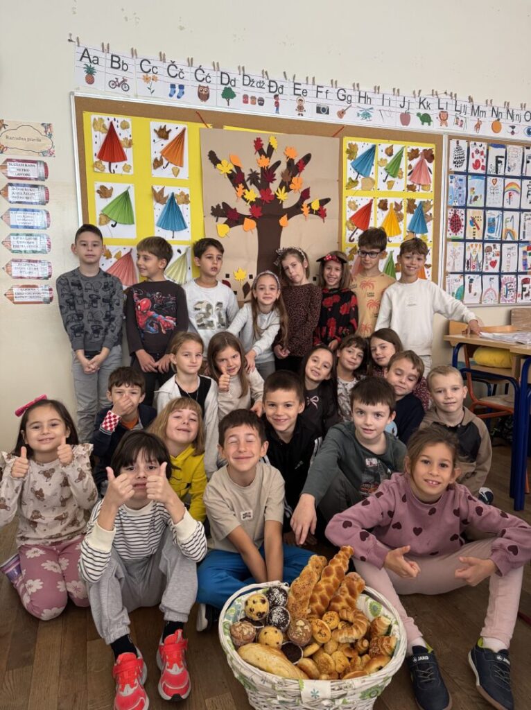 Djeca su donijela razne domaće kruščiće i jesenske proizvode te s puno truda uredili košaru s pekarskim proizvodima te jesenski razredni kutak.
