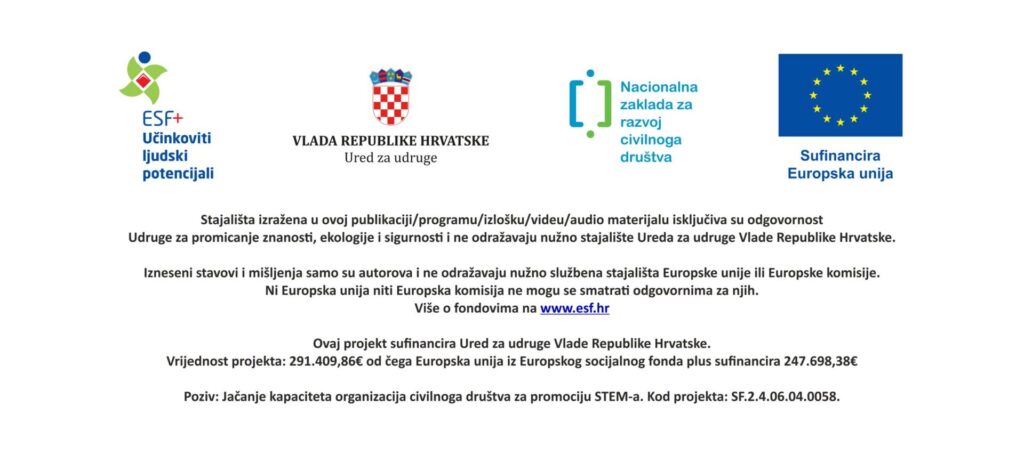 Stajališta izražena u ovoj publikaciji/programu/izlošku/videu/audio materijalu isključiva su odgovornost Udruge za promicanje znanosti, ekologije i sigurnosti i ne odražavaju nužno stajalište Ureda za udruge Vlade Republike Hrvatske. Izneseni stavovi i mišljenja samo su autorova i ne odražavaju nužno službena stajališta Europske unije ili Europske komisije. Ni Europska unija niti Europska komisija ne mogu se smatrati odgovornima za njih.